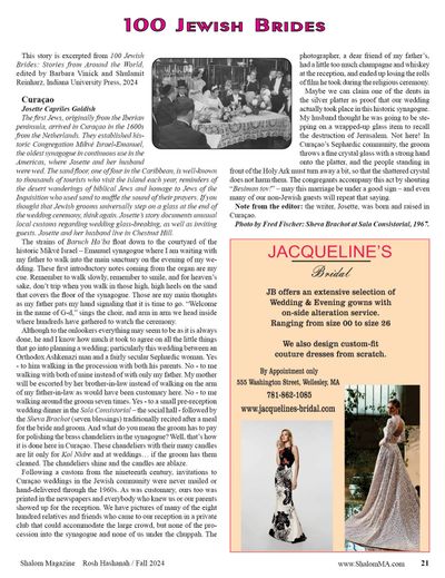 The first Jews, originally from the Iberian peninsula, arrived in Curaçao in the 1600s from the Netherlands. They established historic Congregation Mikvé Israel-Emanuel, the oldest synagogue in continuous use in the Americas, where Josette and her husband were wed. The sand floor, one of four in the Caribbean, is well-known to thousands of tourists who visit the island each year, reminders of the desert wanderings of biblical Jews and homage to Jews of the Inquisition who used sand to muffle the sound of their prayers. If you thought that Jewish grooms universally step on a glass at the end of the wedding ceremony, think again. Josette’s story documents unusual local customs regarding wedding glass-breaking, as well as inviting guests. Josette and her husband live in Chestnut Hill.