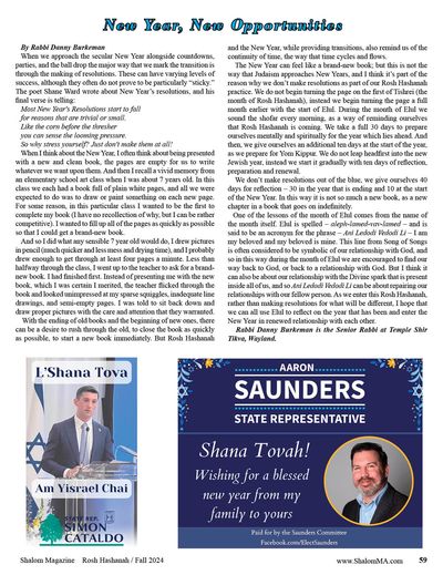 The New Year can feel like a brand-new book; but this is not the way that Judaism approaches New Years, and I think it’s part of the reason why we don’t make resolutions as part of our Rosh Hashanah practice. We do not begin turning the page on the first of Tishrei (the month of Rosh Hashanah), instead we begin turning the page a full month earlier with the start of Elul. During the month of Elul we sound the shofar every morning, as a way of reminding ourselves that Rosh Hashanah is coming. We take a full 30 days to prepare ourselves mentally and spiritually for the year which lies ahead. And then, we give ourselves an additional ten days at the start of the year, as we prepare for Yom Kippur. We do not leap headfirst into the new Jewish year, instead we start it gradually with ten days of reflection, preparation and renewal.